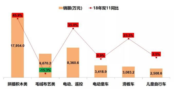 在今年天猫双十一玩具品类中益智开发类玩具增长最为明显,其中拼插积木类销售额最高,总销售额接近1.80亿元,同比增长45.9%;其次是电动、遥控类,销售总额是8360.6万元;第三名是毛绒布艺类,总销售额是6670.2万元。随着消费的升级和家庭育儿观的改变,新生代父母格外看重宝宝的早期培养,愈加重视宝宝的想象力、创造力及动手能力。因此,在众多的玩具品类中,妈妈群体最为推崇拼插、积木类玩具,一方面既能让宝宝动脑动手,又能发挥孩子无限的想象力。可见,拼插积木类玩具已然成为玩具品类中的最火爆产品。